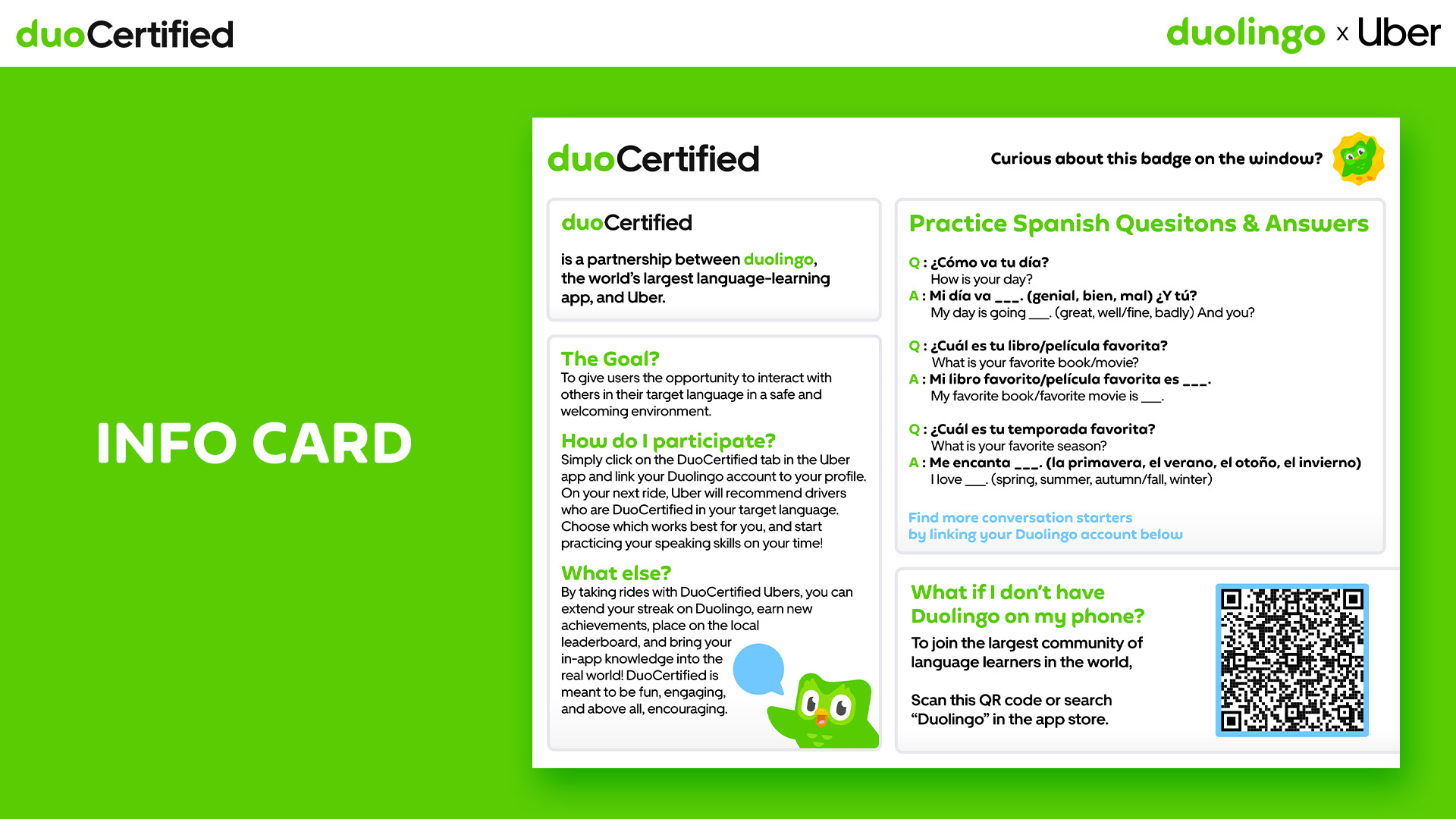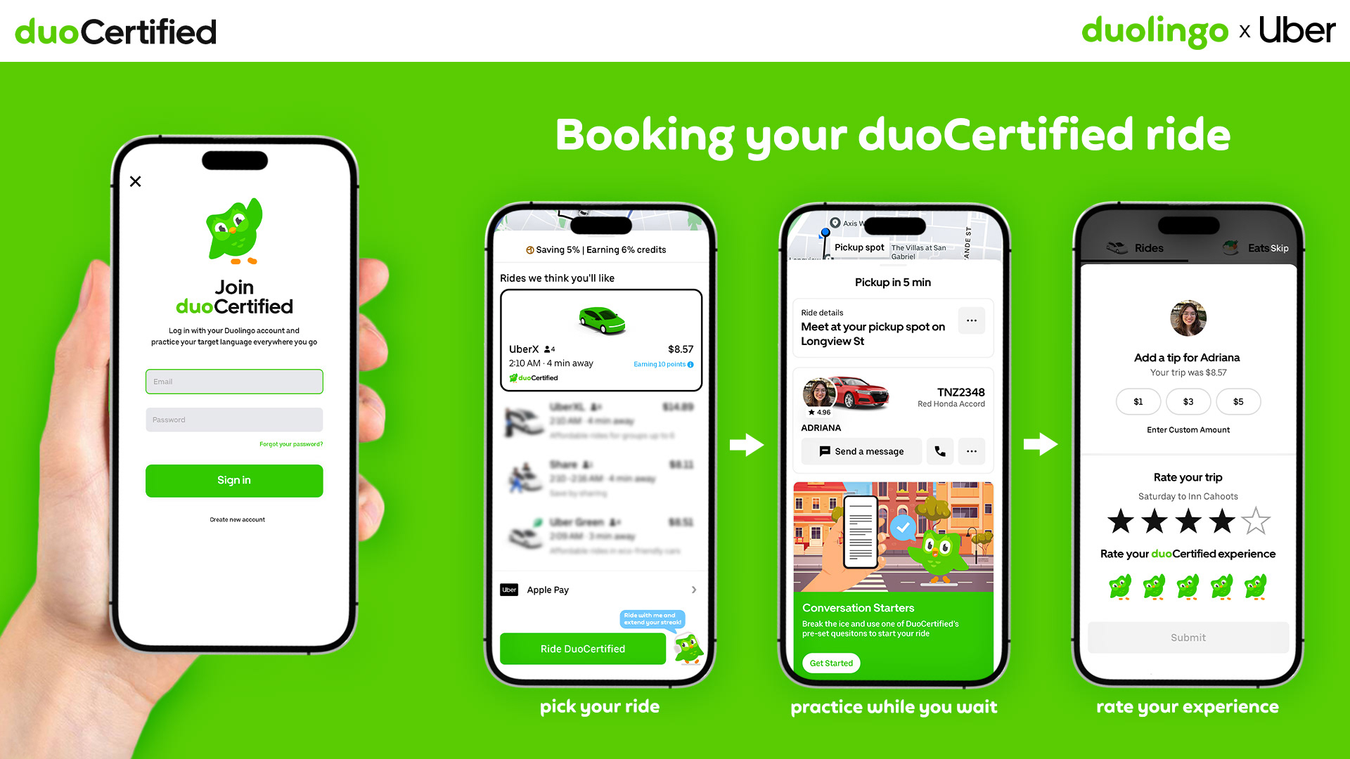 So, we'll start one for them by partnering with Uber to create DuoCertified, offering users a safe and welcoming environment to practice their target language through real-life interactions.